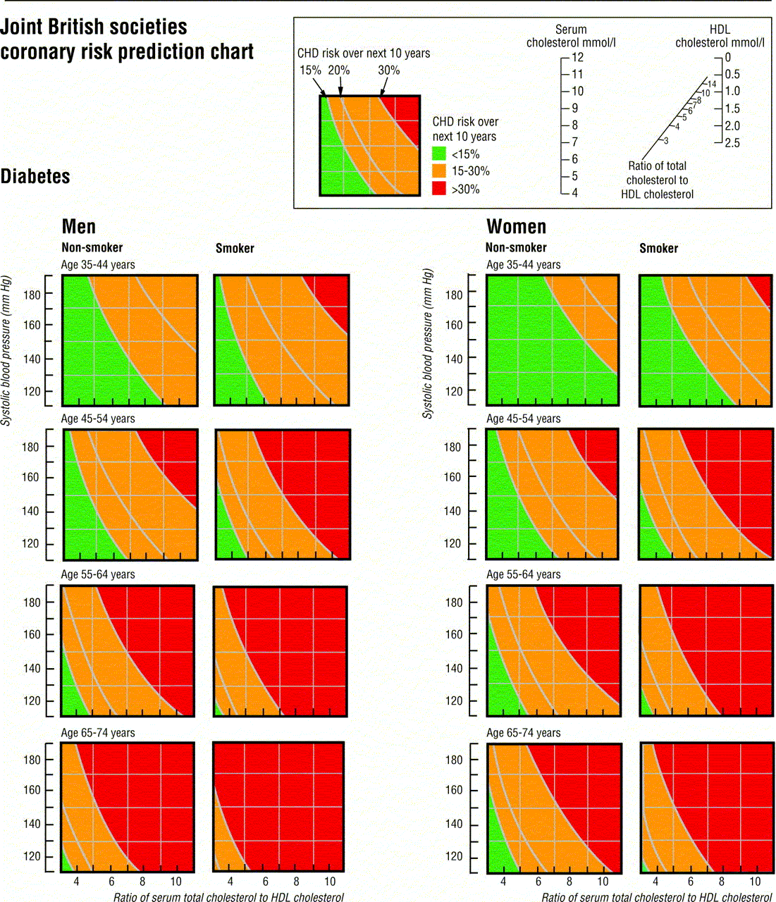 Risk chart for patients with no diabetes Risk chart for patients with diabetes To estimate an individuals absolute 10 year risk of developing CHD, use the appropriate chart for diabetes or no diabetes and find the table for their sex, smoking status (smoker/non-smoker), and age. Within this square define the level of risk according to systolic blood pressure and the ratio of total cholesterol to HDL cholesterol. High risk individuals are defined as those whose 10 year risk of CHD exceeds 15% (equivalent to a cardiovascular risk of 20% over the same period). As a minimum, those at highest risk (>30%; red) should be targeted and treated now, and as resources allow others with a risk of >15% (orange) should be progressively targeted.